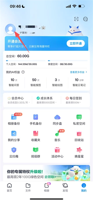 在天翼云盘首页,点击底部我的,进入个人页面。