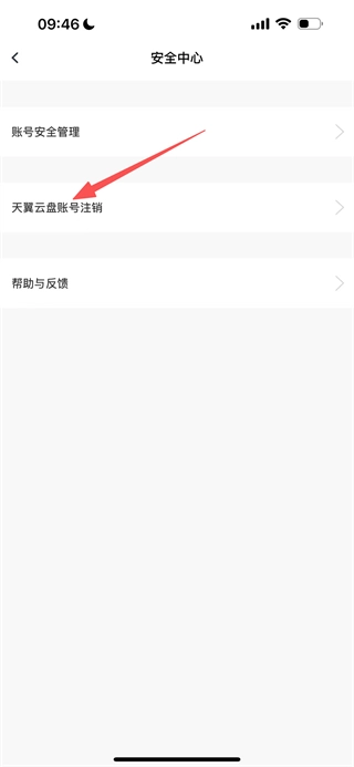 在安全中心页面,找到并点击天翼云盘账号注销选项,即可进入账号注销说明页面。