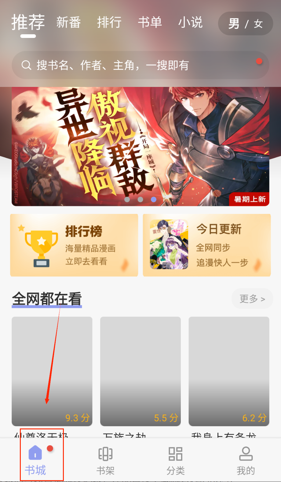 登录之后就能浏览首页的推荐内容啦,这里会展示热门漫画和新番更新,左右滑动就能查看不同分类的作品推荐。