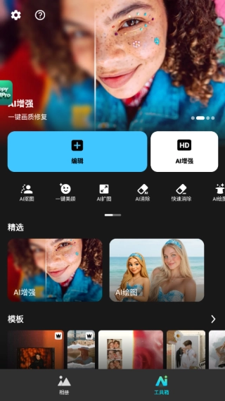 1、于工具箱内能够执行编辑、智能增强、智能抠图、一键美颜、智能扩图等操作。