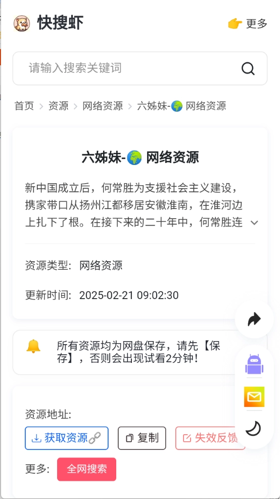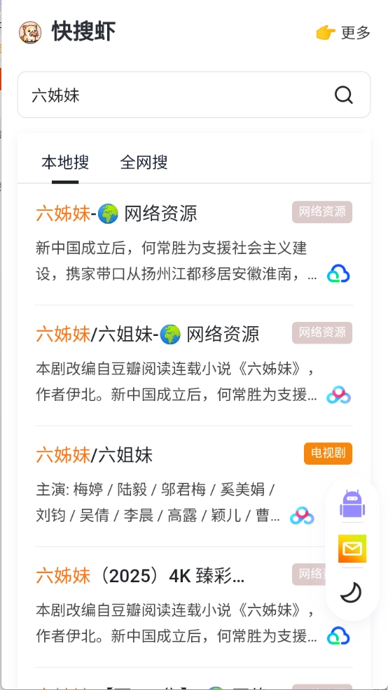 快搜虾是一款功能强大的资源搜索工具,专注于影视资源的检索,涵盖电视剧、电影、综艺等多种类型,搜索效率十分高效。其首页设有丰富的影视排行榜,方便用户快速找到心仪的影视内容,此外还提供学习资料、办公软件等其他实用资源。