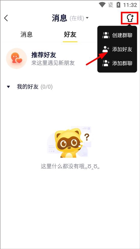 进入消息页面后,能看到消息、好友、群组等功能选项;若要添加好友,用户只需点击页面右上角的头像即可。