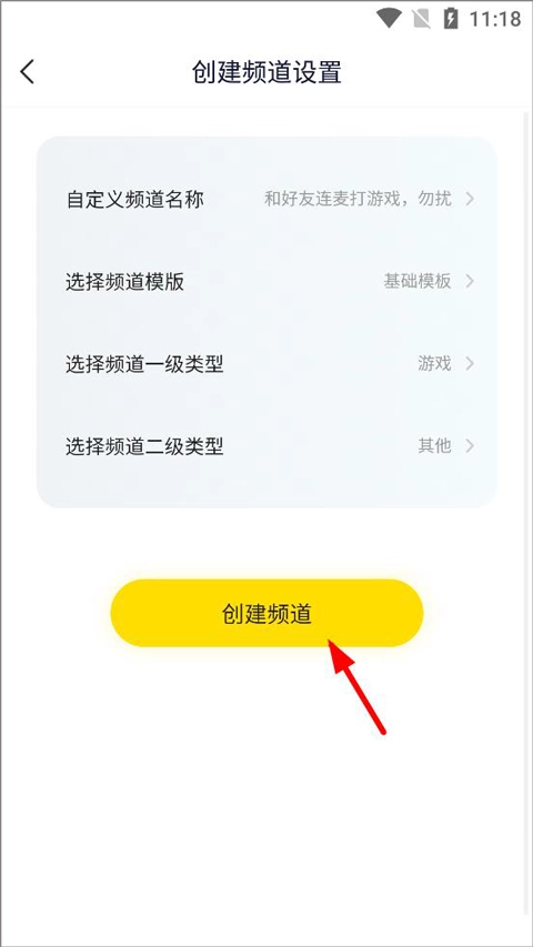 进入创建频道的设置界面,填写频道名称、选择模板与类型后,点击创建按钮即可完成操作。