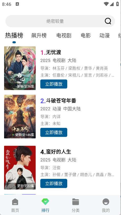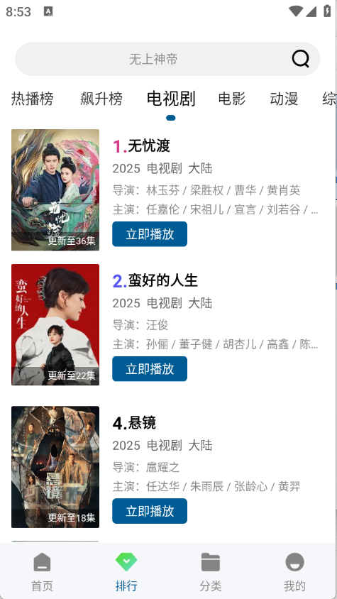 “排行”页面,根据当前热度将影视进行了智能排序。