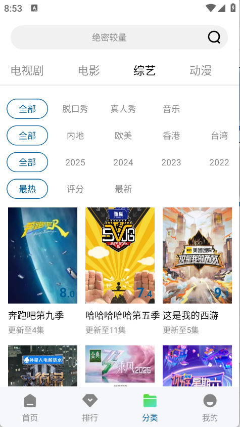 进入首页后,顶部栏陈列着丰富的影视资源,涵盖电视剧、电影和综艺等类别。