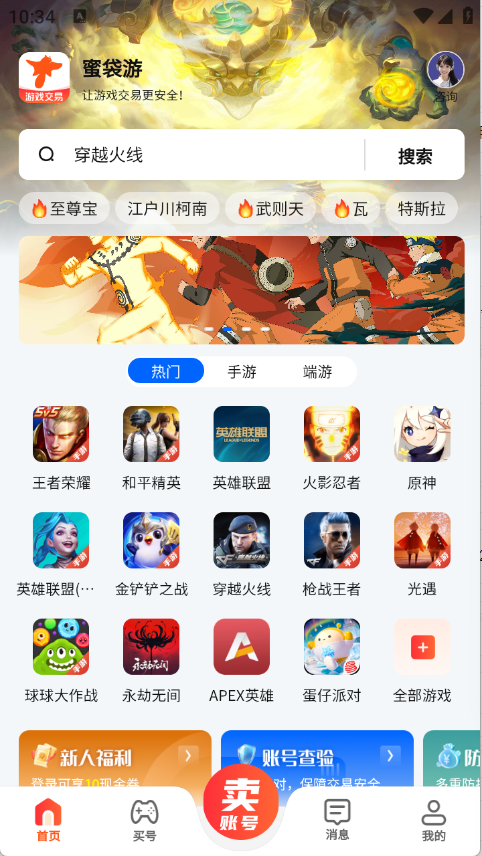 首页页面汇集了众多游戏账号,涵盖王者荣耀、蛋仔派对、和平精英等热门游戏。