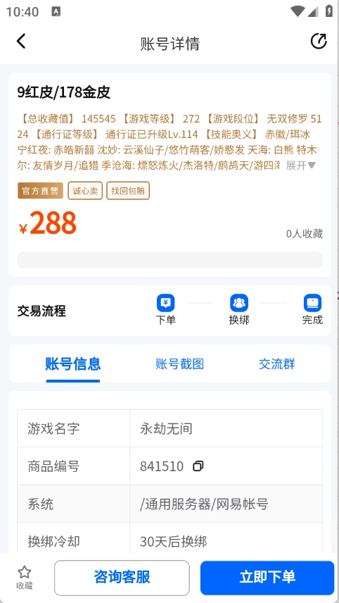 找到并点开需要的账号之后点击“立即下单”即可。