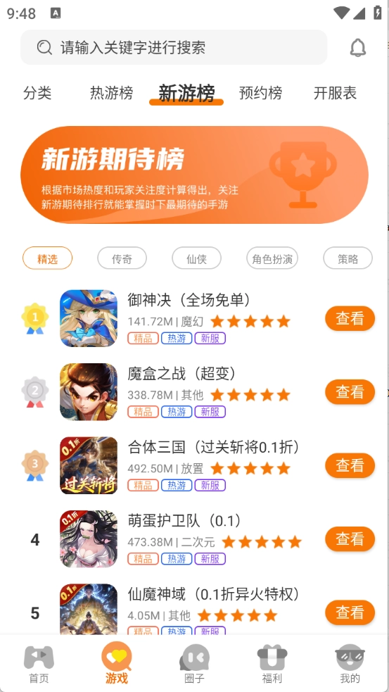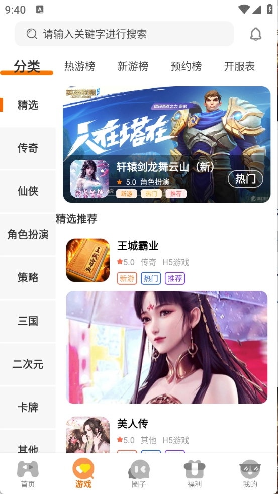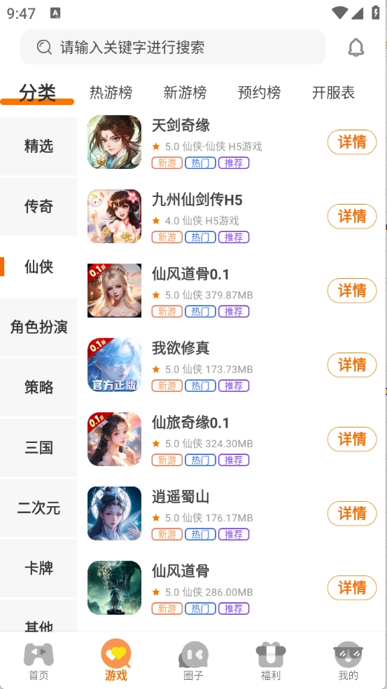 游戏栏目对各类游戏进行了细致分类,涵盖了仙侠、传奇、射击等多种类型。