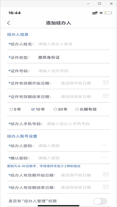 点击列表中的【+经办人】按钮即可跳转至添加经办人页面,随后按照页面提示输入经办人信息——这其中涵盖了经办人身份四要素信息,以及有效开始时间与结束时间;同时还需设定该经办人是否具备管理权限:若拥有此权限,经办人登录系统后便能开展企业印章信息维护、印章授权等操作;若不具备,则无法进行企业电子印章操作、印章授权等相关功能。信息填写完毕后,需进行操作人员的人脸验证。只有当经办人信息核验成功且人脸验证通过时,经办人添加才算成功,此时返回列表就能查看新增的经办人信息。具体内容如下图所示: