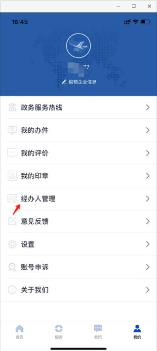 企业法人登录吉事办后,在【我的】页面中点击【我的经办人】选项,即可进入经办人列表页面。具体操作界面可参考下图: