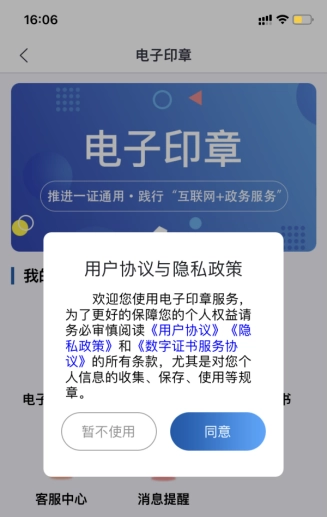 设定密码后点击【激活】按钮,激活成功后即可进入印章模块页面。用户需同意数字证书等相关协议,方可使用印章功能。