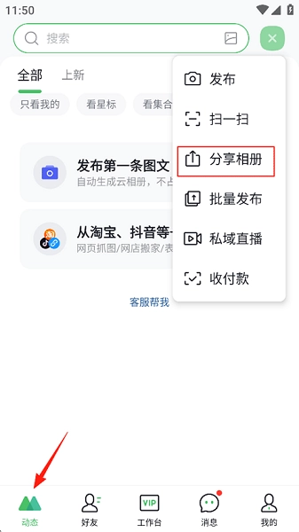 打开微购相册,在动态页面点击右上角的+图标,选择分享相册。