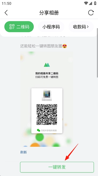 在分享相册页面,您可以把二维码展示给他人扫码来分享相册,也能点击下方的一键转发按钮完成分享。