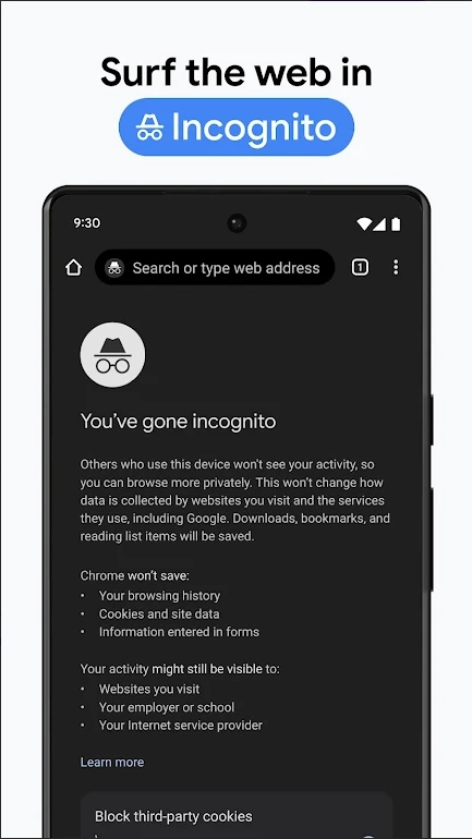 无痕式浏览。您可以使用无痕模式浏览互联网 - 在这种模式下,系统不会保存您的历史记录。在您的所有设备上,您都能私密地浏览。