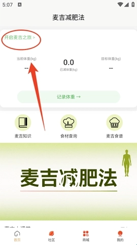 进入软件后,你的麦吉减肥之旅就可以开启了,请完善个人信息并记录体重吧。