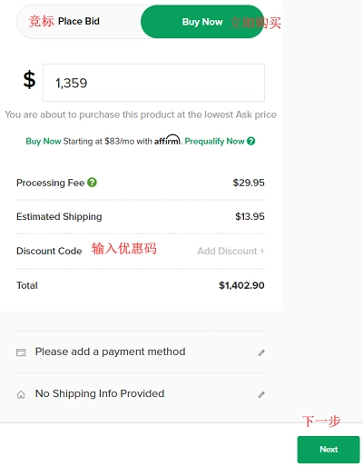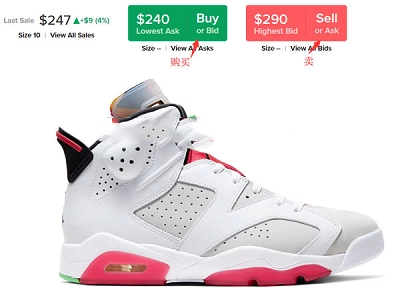 不管是打算直接入手,还是得参与bid竞价,点击那个绿色按钮准没错,之后再挑选尺码就行啦。