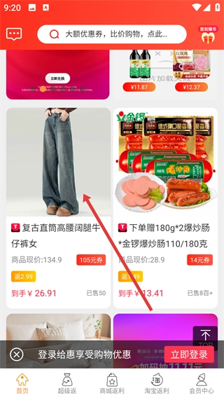 进入首页后,您可以浏览【复古直筒高腰阔腿牛仔裤女】这类推荐商品,同时还能了解相关的优惠信息。