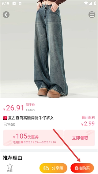 点击像【复古直筒高腰阔腿牛仔裤女】这类商品进入详情页面,就能查看【到手价-26.91】之类的信息,点击【直接购买】按钮即可开展下单流程。