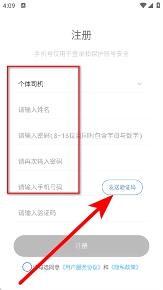 选择注册角色,依次填写姓名、密码、确认密码和手机号码,随后点击“发送验证码”按钮。