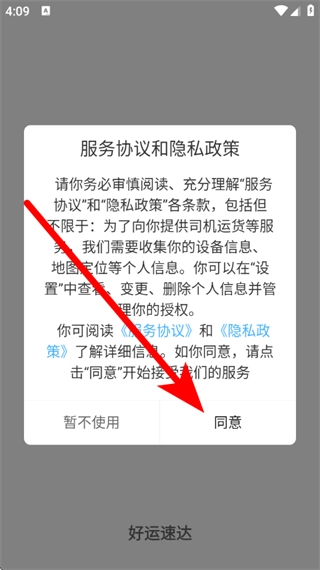 打开好运速达应用后,当弹出服务协议与隐私政策的确认窗口时,点击“同意”按钮即可。