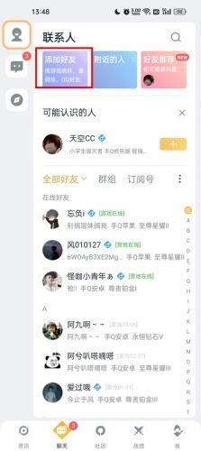 3、点击下方的聊天之后,会来到联系人页面,上方有三个端口,分别是添加好友、附近的人、好友推荐、选择添加好友。