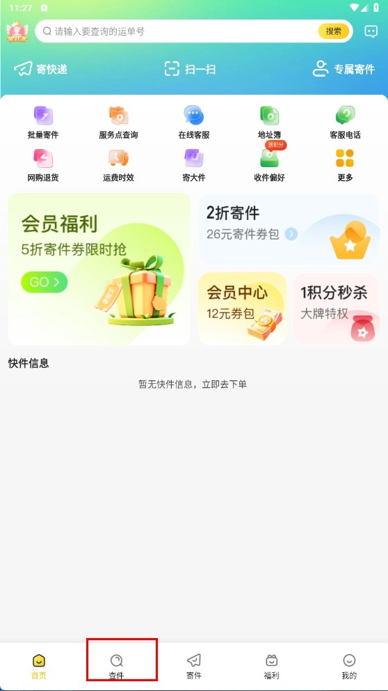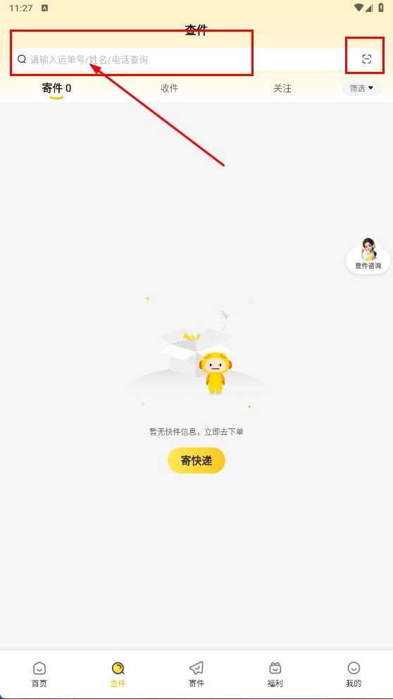 ,在搜索栏输入运单号、姓名或电话查询快件。