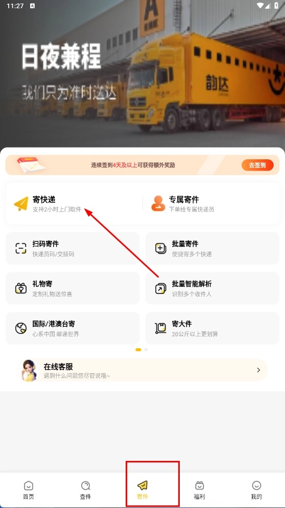 点击页面底部的【寄件】功能按钮,进入寄件页面后,选择【寄快递】功能选项。