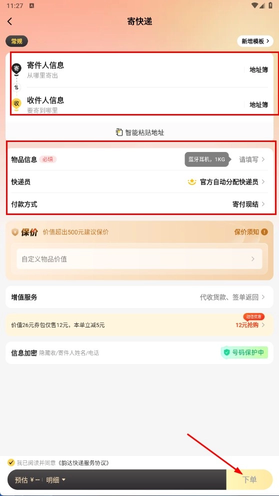 在快递寄送页面,依次填写寄件人信息、收件人信息以及所寄物品的相关内容,待所有信息填写完毕后,点击页面上的【下单】功能按钮,即可完成整个寄件流程。