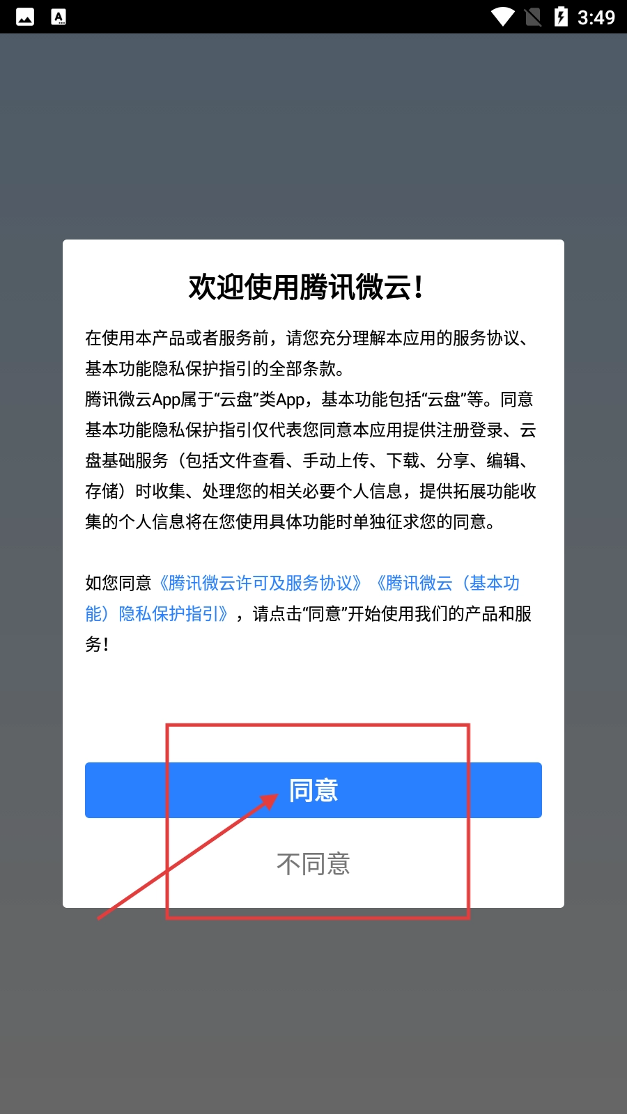打开【腾讯微云】后,在弹出的服务协议与隐私保护指引提示框里,点击【同意】按钮。