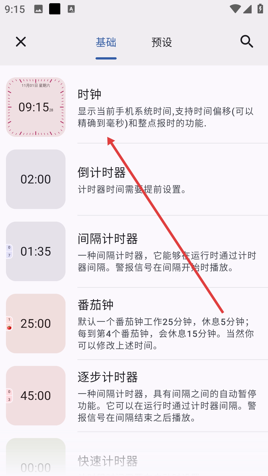 在计时器类型选择界面中选择【时钟】选项,此功能能够展示当前手机系统的时间,并且支持时间偏移设置以及整点报时功能。