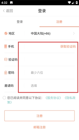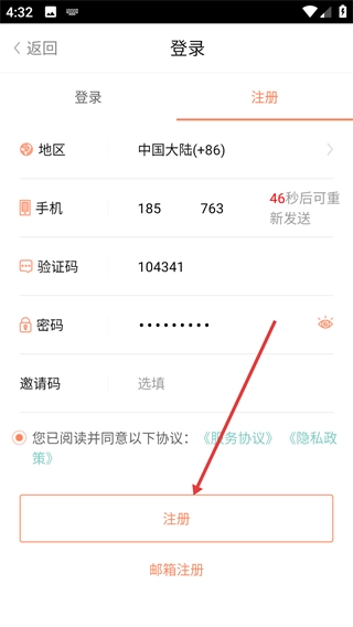 在注册页面填写手机、验证码、密码等信息,并勾选同意相关协议。