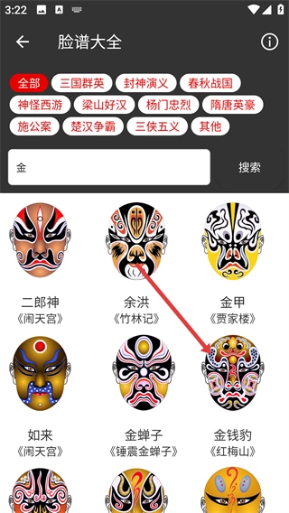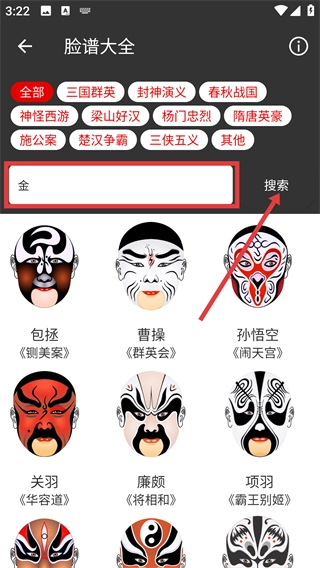 在【脸谱大全】页面的搜索框中输入【金】字,接着点击【搜索】按钮,即可得到相关的脸谱搜索结果。