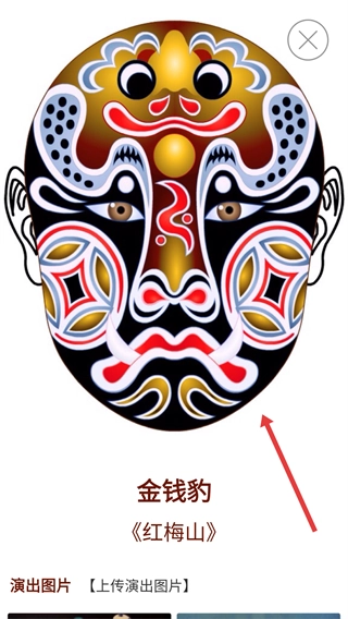 进入后能够查看【金钱豹-《红梅山》】脸谱的详细图案,并且可以开展上传演出图片等相关操作。