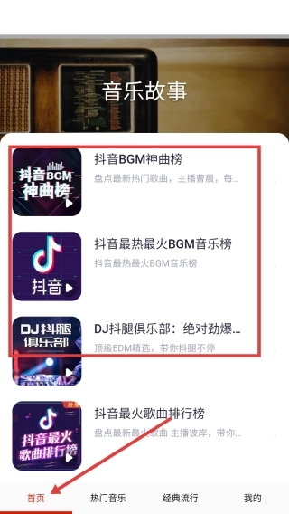 在【首页】看音乐故事选歌单播放。