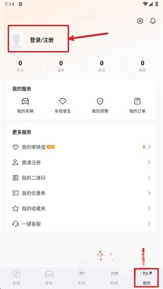 打开哪吒汽车App,点击右下角的“我的”选项,进入个人中心页面后,点击顶部的“登录/注册”按钮完成账号绑定操作。