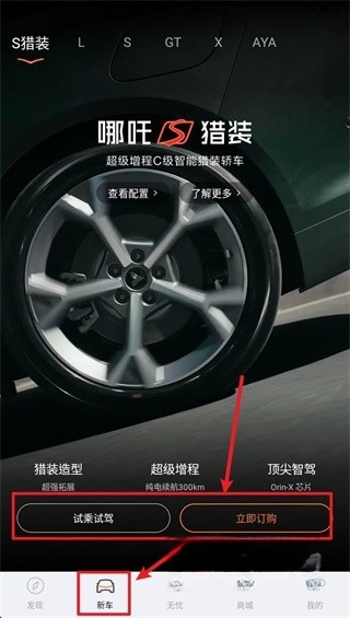 点击页面底部的“新车”选项,即可进入车型展示页面。在该页面挑选心仪的车款后,您可以选择申请试驾,也可以直接下单购买。