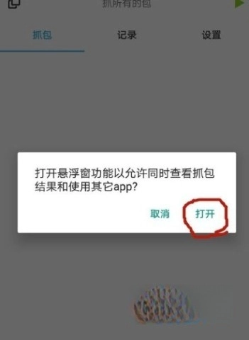 系统会提示用户开启悬浮窗权限,这样就能在使用其他应用时同步查看抓包结果,直接点击打开就可以了。