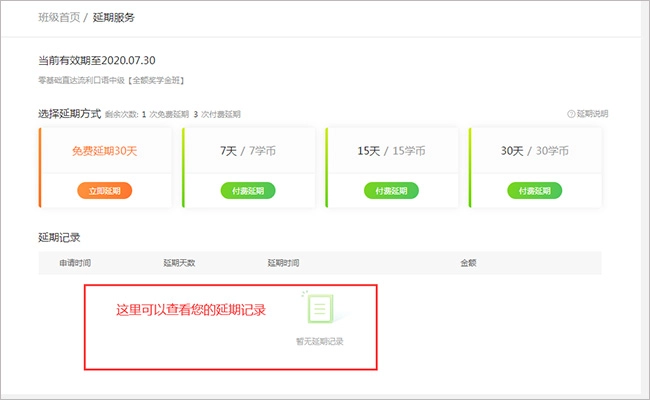 进入延期服务页面后,可对课程执行延期操作,具体操作步骤详见下图。