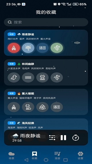收藏页面呈现了丰富多样的白噪音素材,支持一键播放。