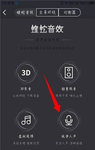 之后就能看到顶部的菜单选项,可选择蝰蛇音效的全景环绕和均衡器功能。具体如图所示