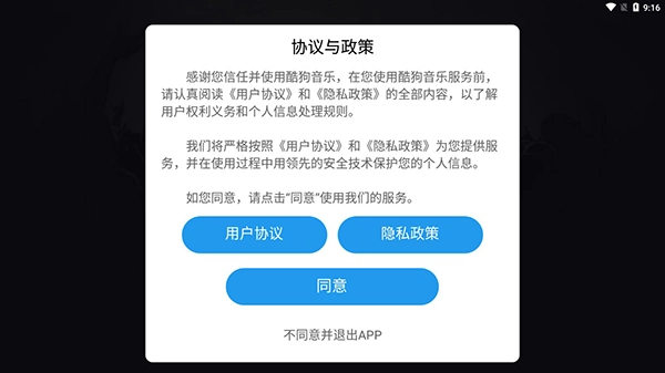 安装本站提供的酷狗音乐应用,打开软件后需先同意用户协议才能继续使用。