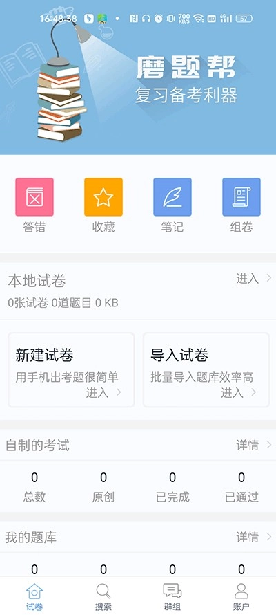 打开手机上的磨题帮App,进入首页后点击“导入试卷”按钮。