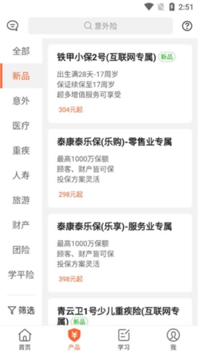 在向日葵保险人的产品界面上,用户能看到种类丰富的产品分类。
