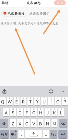 最后挑选圈子、输入要发布的内容,接着点击右上角的发布按钮就可以啦!