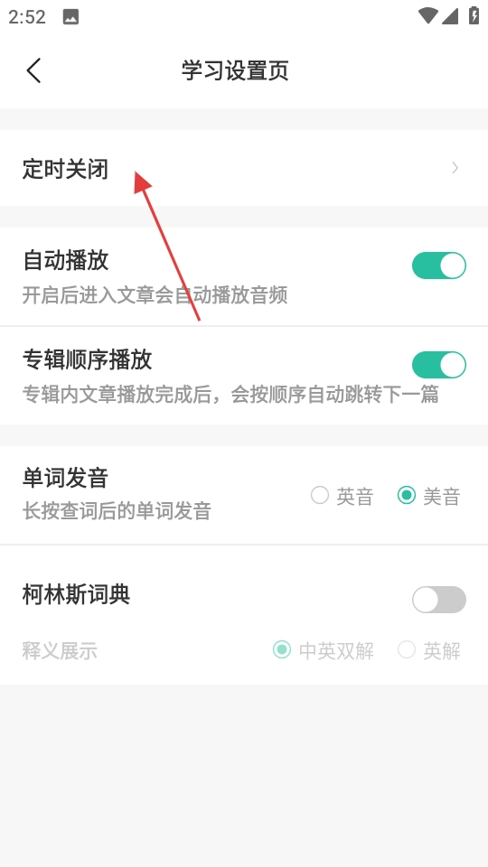 3、在学习设置页,点击定时关闭选项,进入定时关闭设置页面。