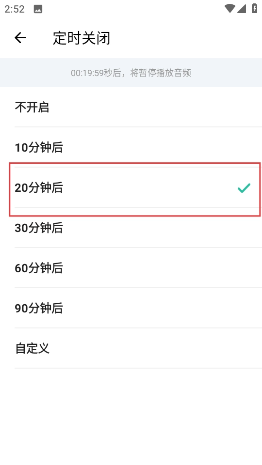 4、在定时关闭设置界面,能够挑选定时关闭的时长,例如选择20分钟后。