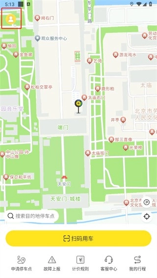 首先打开小黄鸭出行APP,进入首页后可直接扫码用车,此时点击左上角的【人像图标】即可。
