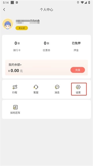 在个人中心页面里,有行程、客服、消息、设置以及如何还车这些功能选项,接下来请点击【设置】。