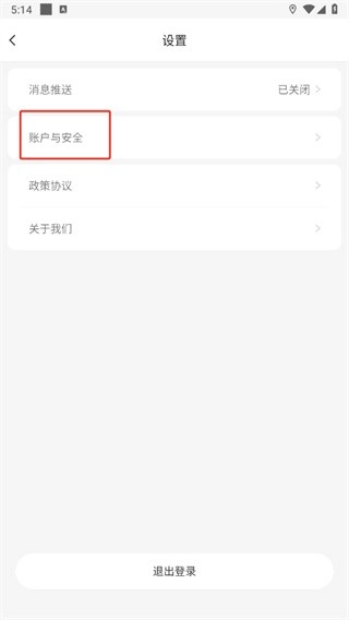 接着进入设置页面后,能看到消息推送、账户与安全、政策协议、关于我们这些选项,接下来需要点击【账户与安全】。