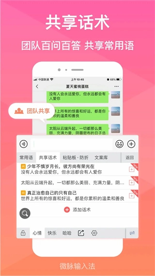 微脉输入法是一款专业实用的高效输入工具,朋友圈文字折叠、团队共享常用语、花样字符模板、特殊字体、团队图册共享、快速发图等专属微商功能,助力用户轻松实现输入内容不折叠。这款输入法功能强大,涵盖便捷短语、特殊字符模板、语音输入等实用功能,操作简单便捷,用户还能根据需求自定义添加常用语。